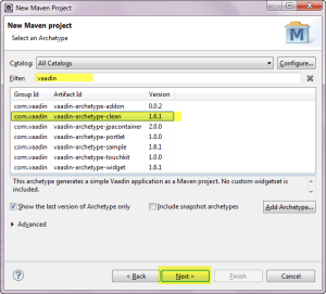 4. On the filter you type Vaadin. And select for Vaadin-architype-client version 1.6.1. and Press Next