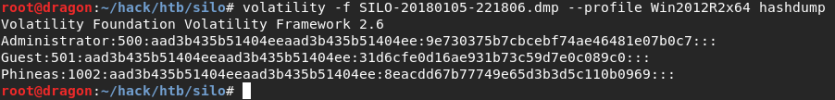 volatility -f SILO-20180105-221806.dmp –profile Win2012R2x64 hashdump