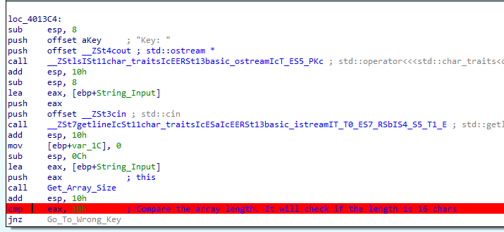 Based on the condition that the application key shall be 16 chars so that with only 5 keys then the application will direct you to Go_To_Wrong_Key section