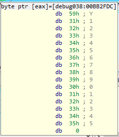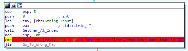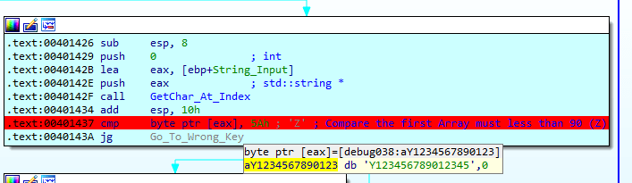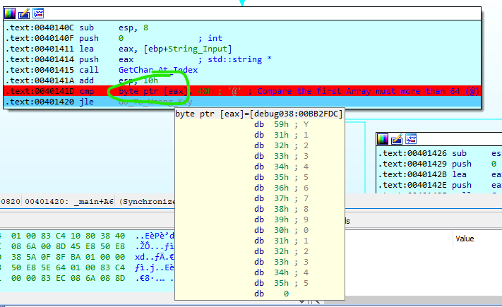 If we hover our mouse to byte ptr [eax] then we can see that the input value from the application as the picture shown above. the command cmp byte ptr [eax], 40h means it will compare the first char of the array is more that 64 where Y is 89 in decimal.