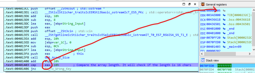 I only entered 5 char into the input. We can see that the Get_Array_Size return value that is stored in eax is equal to 5