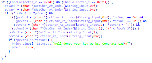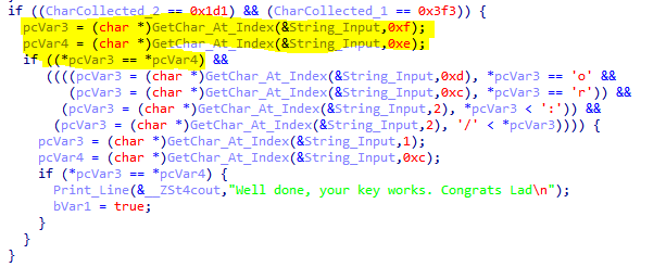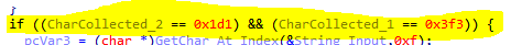 The second check will validate that CharCollected_1 = 1011 where the assembly code is cmp [ebp+CharCollected_1], 3F3h