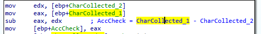 mov edx, [ebp+CharCollected_2] is saving the value of CharCollected_2 (465) to edx. mov eax, [ebp+CharCollected_1] is saving the value of CharCollected_1 (1011) to eax. The next is to sub eax, edx which is substract the second operand (edx) from the first operand and save the result in the first operand like below