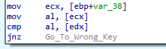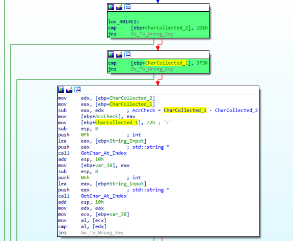 Let follow one by one of the code. You can see the above assembly code that there are two comparisons in series which comparing the the result of two previous loops. The condition will check that CharCollected_2 = 465 where the code is cmp [ebp+CharCollected_2], 1D1h