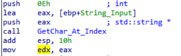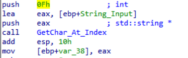 Next code operation is to get the 15th element of the array and save it in var_38. Remember that every return if the function will be saved in eax. mov [ebp+var_38], eax –> will store the returned value to var_38