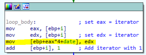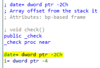 We can see that mov [ebp+eax*4+date] is the operation that assigning the value to array index. But we can see there is additional variable ‘date‘. What is date ?