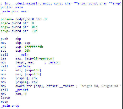 First what you need to do is recognize where is the first object initiation. In the above code sample in setdata function we can see person is passed variable which is assigned address after EBP.