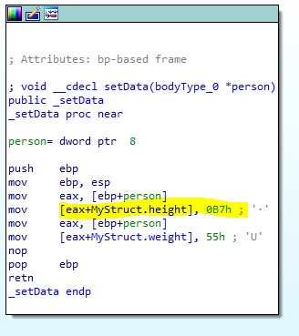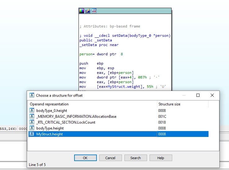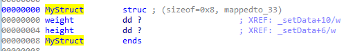 You can select MyStruct.Weight+4 then the code will be changed to become like this below. Basically IDA will detect that when EAX is MyStruct then EAX + 4 it means it will suggest us field with offset 4 that is height as seen below