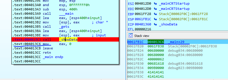 We can see the above return address of the stack is still good which point to the original address in the main function 004013C6. Now lets do overflow