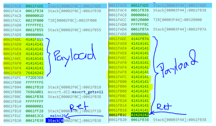 We can see the below stack difference between my previous payload and second payload, with the bigger payload the overflow happen which is impacting the return address of stack which originally should point back to the main function 004013C6 but now the return address change to 42424242 which is our last 4 bytes of the payload (BBBB)