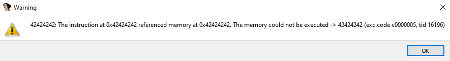 if we continue the debugging IDA will show the warning like below because memory address 0x42424242 does not exist when executing the return