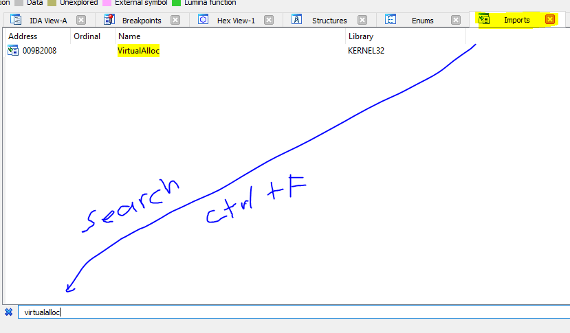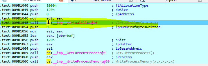 Now you can assess the virtualalloc, We are looking call trace from main function. Then you can go to the main function to see the original call by double clicking line.