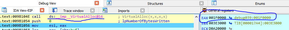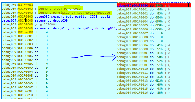 here is the allocated memory. The best thing that IDA is able to detect the permission as well. So we need to take note that 0x1F0000 is the start address.
