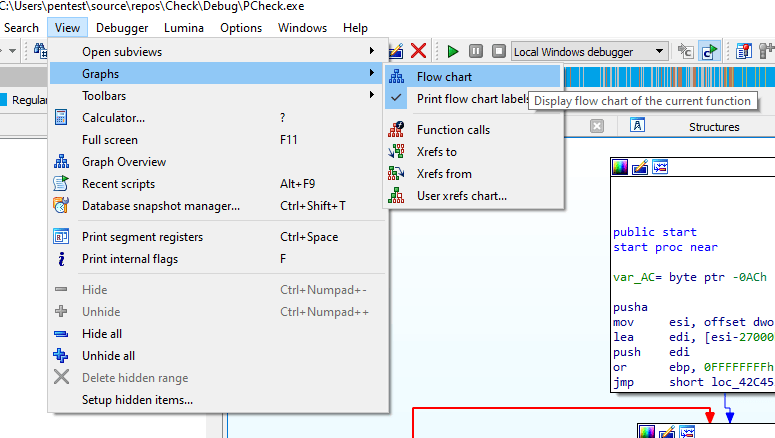 What IDA can read is basically the unpacker stub. Here we should be able to identify when the unpacker stub hand over the new entry point to the original file. We can use the function available in IDA using Flow Chart