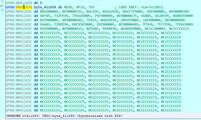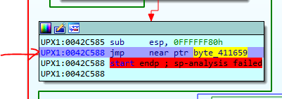 If you are using IDA, it will tell you that the application will jump to something that does not exist because the code in that memory address is still not identified initially. We can assume that could be the original application entry point. Here I use UPX packager.