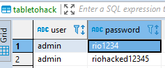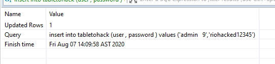 insert into tabletohack (user , password ) values ('admin 9','riohacked12345')