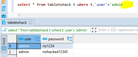 select * from tabletohack t where t.`user`='admin'