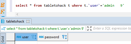 select * from tabletohack t where t.`user`='admin 9'