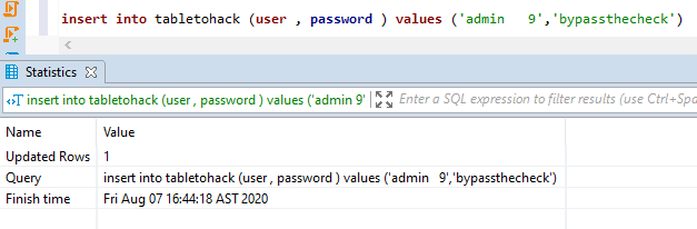 insert into tabletohack (user , password ) values ('admin 9','bypassthecheck')