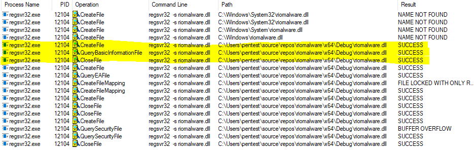 I have a very simple dll which let us assume this is our malware sample that we run and load using regsvr32. The dll is doing some activities such as writing a file, check file exist and start calculator