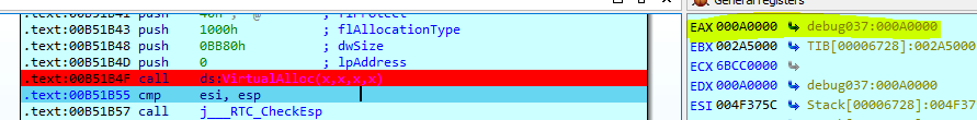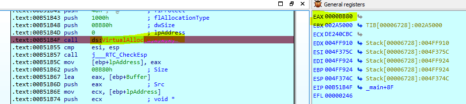 So we need to put break point on VirtualAlloc call to get the memory address from the eax.