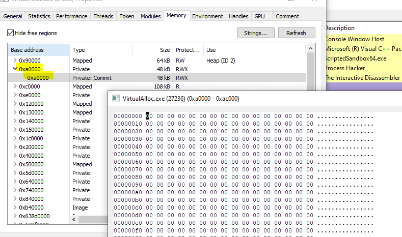 Now we can check the memory space around the 000A0000 is still empty. You can do syncronize with EAX in the hex view to show the memory content