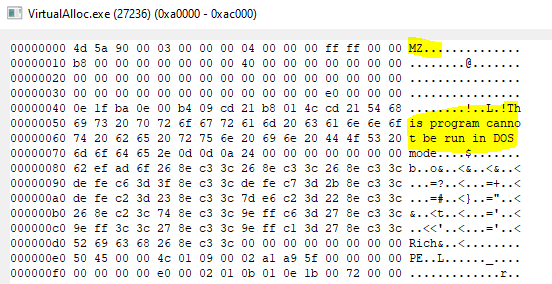 Now we can see that that memory space now are filled with content that we are not sure yet what it is. But we know that it starts with MZ, which is the indication of binary files and followed by This program cannot be run in DOS