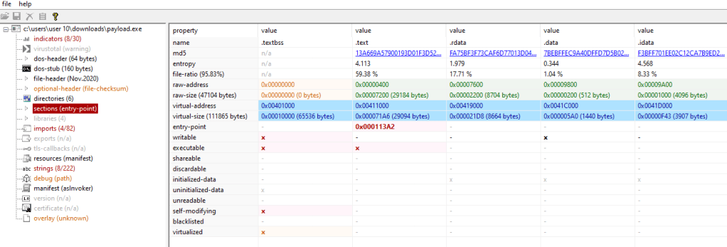 Or you can look for the details using PE Studio. We can see that the binary file is fully extracted