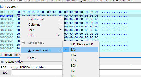 Now we can check the memory space around the 000A0000 is still empty. You can do syncronize with EAX in the hex view to show the memory content