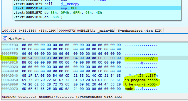 Now we can see that that memory space now are filled with content that we are not sure yet what it is. But we know that it starts with MZ, which is the indication of binary files and followed by This program cannot be run in DOS