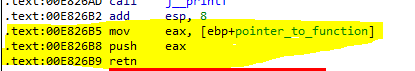 With the above code, we can achieve the same call test() function. First, we push the address of the test() function into the stack to put this on the very top of the stack. Then by calling the RETN the EIP will be directed to that function address.