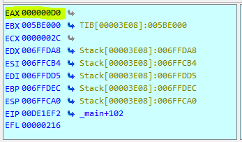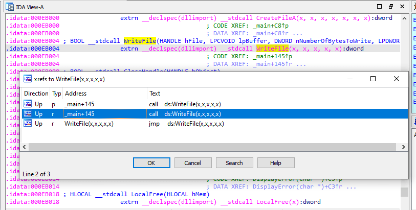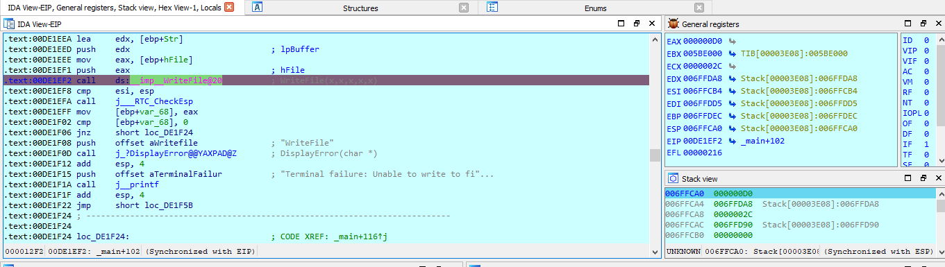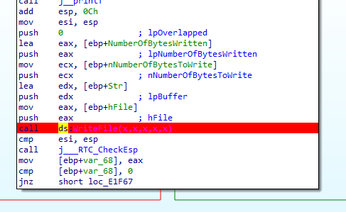 Now the breakpoint is hit. Now we need to find what is the handle information can be gathered. If we look at the Writefile function call below, the handle will be in the first parameter