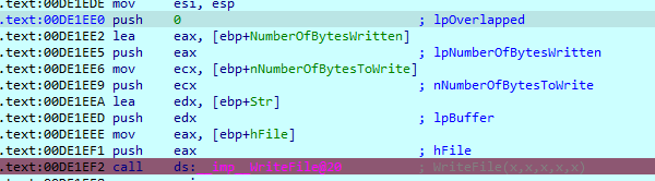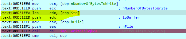 in order to see what is the content. We can look for the 2nd parameter being passed to the WriteFile function. The content will be passed in the second parameter as buffer. So it will be pushed in the second last from the WriteFile call.