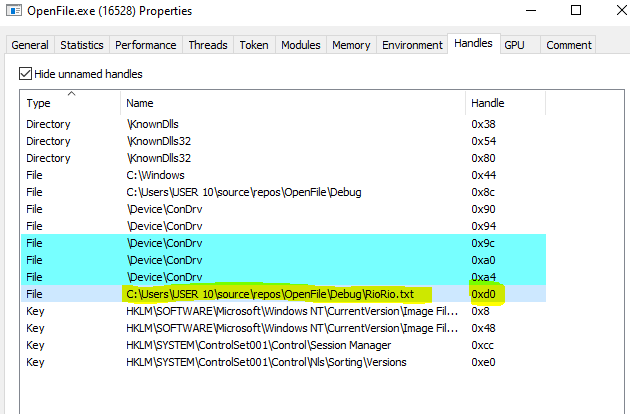 To make the life easier to find the handles detail we can find it using Process Hacker by double clicking on the program where in this case is OpenFile.exe