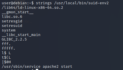 We can see that this application (suid-env2) will execute apache2 with /usr/sbin/service apache2 start