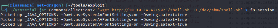 - Generate the serialized object file using ysoserial. With the command bleow we are transfering file from the attacker and copied to /dev/shm/