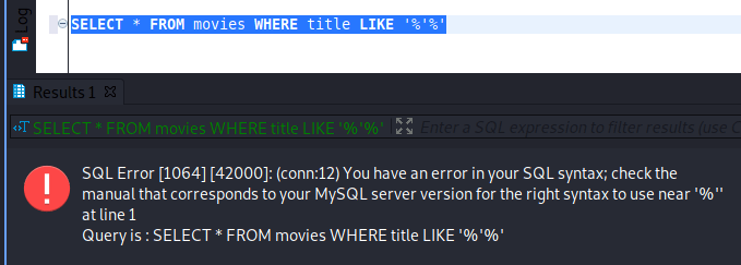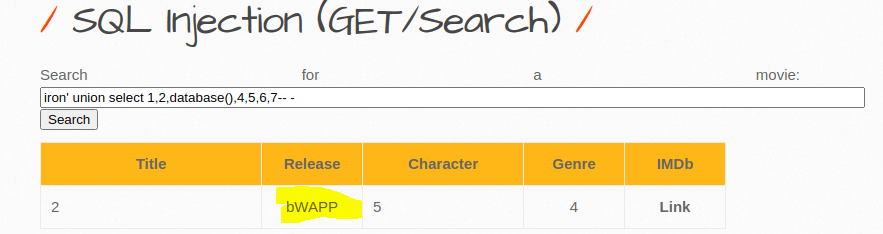 The complete query will become like this SELECT * FROM movies WHERE title LIKE ‘%iron’ union select 1,2,3,4,5,6,7– – %’