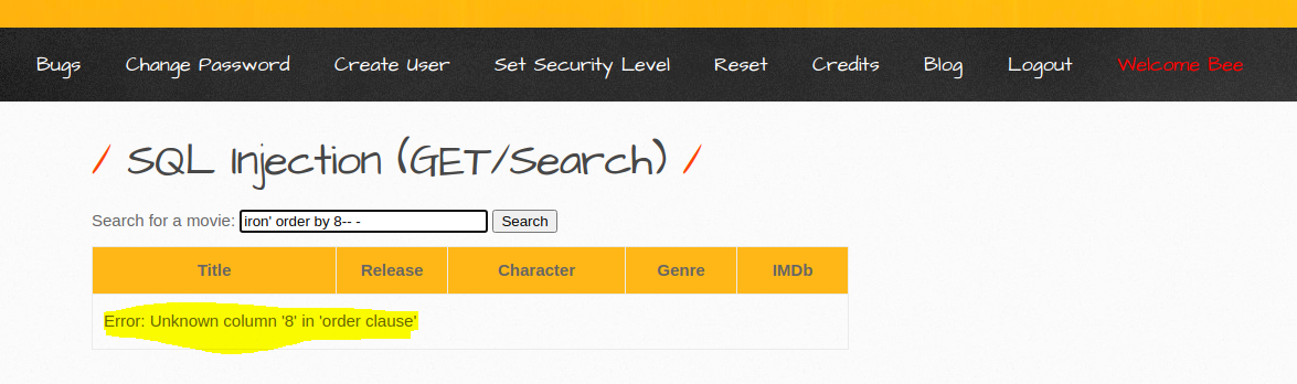 We can assume now that the number of the column is less than 8, in this case the column that is affected to the query is 7 that we can verify in the below image