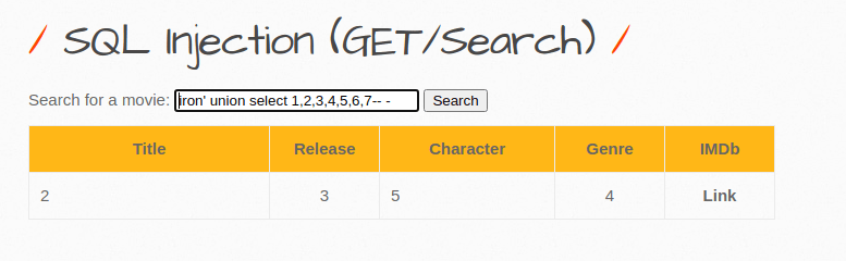 SELECT * FROM movies WHERE title LIKE '%iron' union select 1,2,3,4,5,6,7-- - %'
