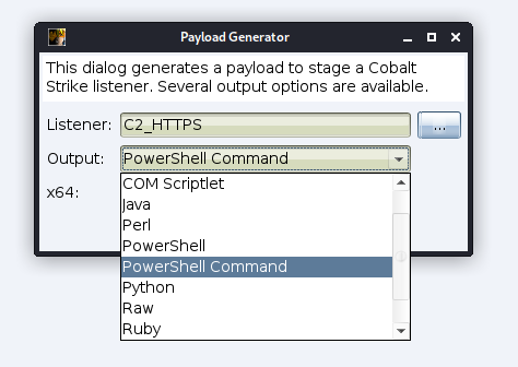 Select the Powershell Command as our payload and press Generate. If your target is 64 bit operating system then you can check use x64 payload