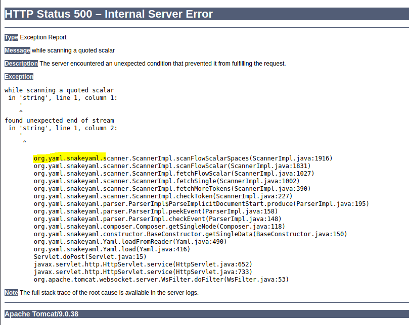 During the enumeration of an application, I found that the application give an error message that allow me to find some good information where this application is using yaml parser from snakeyaml