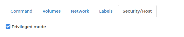 Set the Security/Host to Privileged Mode, this selection is very important that allow the docker image having access to the host.