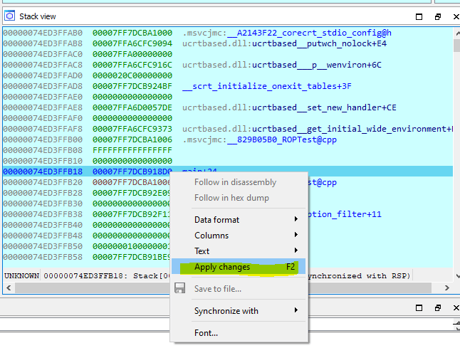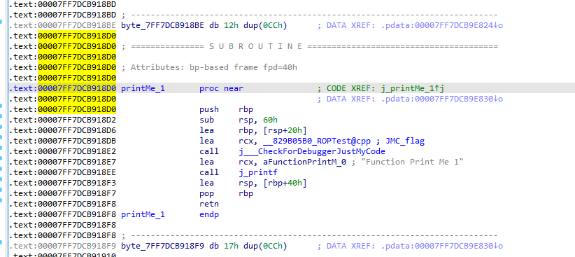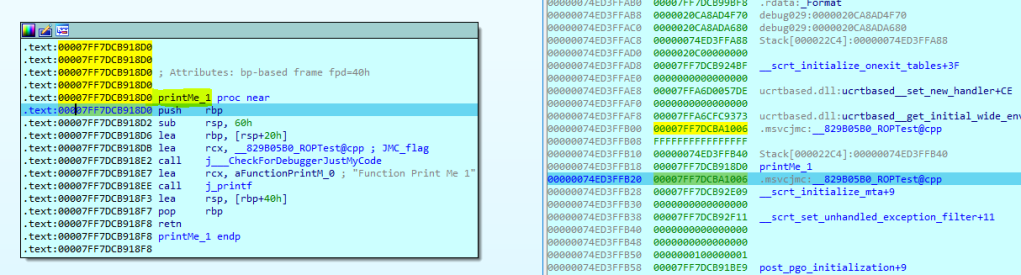 To do the attack, We can change the RET address from 7FF7DCB918A4 to another address, in this case we want to call printMe_1. We need to overwrite the address to point to printMe_1 address 7FF7DCB918D0