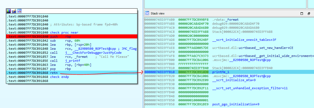 We can see that when Check function is going to return then we can see in the same time on the stack is pointing to printMe_1